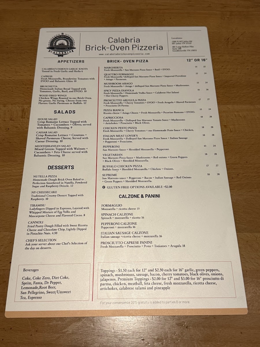 Welcome to Calabria Brickoven Pizzeria - Mt. Juliet, where authentic Italian flavors are immersed in a cozy atmosphere. Nestled in the heart of Mt. Juliet, this pizzeria is a culinary journey that brings Italy closer to home. The menu features a delightful range of options, starting with appetizers like the incredibly popular garlic knots, baked to a perfect golden brown in a wood-fired brick oven, and the refreshing bruschetta, bursting with fresh flavors.